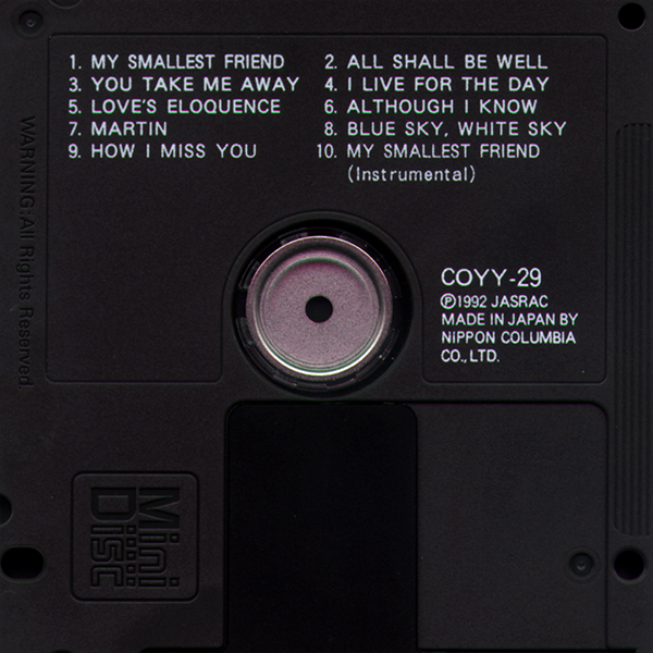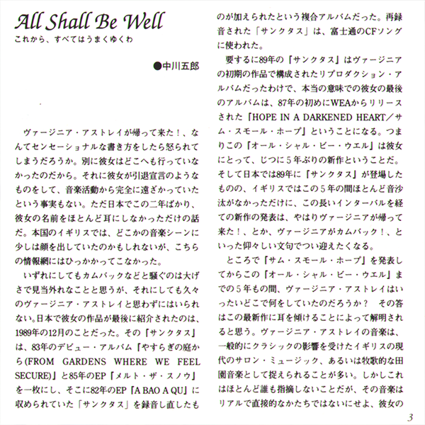 NOTESAll Shall Be Well represented the first Virginia Astley album since 1986's Hope In A Darkened Heart. Virginia had focused the previous five years on raising her daughter, Florence. 'My Smallest Friend' features Florence singing. The booklet for All Shall Be Well featured a biography (in Japanese) and also the lyrics to the songs. The booklet that accompanied this MiniDisc release differs from the CD version as it uses different photos inside. 'Blue Sky, White Sky' was co-written with Kate St John, originally one-third of The Ravishing Beauties and later of The Dream Academy. Kate also embarked on her own solo career in later years.