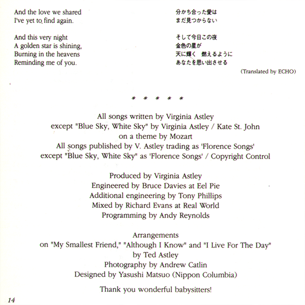 'Blue Sky, White Sky' is based on a theme by Mozart. The string arrangements for 'My Smallest Friend', 'Although I Know' and 'I Live For The Day' were orchestrated by Virginia's father, film and television composer Edwin 'Ted' Astley. |