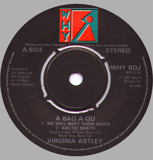 NOTESVirginia had signed to the independent label Why-Fi with a view to establishing a broader platform for her music. Other artists on the Why-Fi roster included Troy Tate and Robert Ellis Orrall. The A Bao A Qu sessions took place in 1981 at producer/engineer Phil Chapman's home studio in London. Virginia's brother Jon Astley also provided co-engineering and production skills. 'We Will Meet Them Again' featured words taken from a translation of Gustav Mahler's Kindertotenlieder (Songs On The Death Of Children). “I first heard the song years ago when I was playing flute in some youth orchestra" commented Virginia in an interview for the NME in 1983, "but the way I do it bears no relation to the Mahler original. I just chose it because the words are so moving. There is nothing sadder than the death of a child.” The melody for 'We Will Meet Them Again' was also used by Virginia for the song 'Joy' which features on the Richard Jobson album The Ballad Of Etiquette. 'Arctic Death' was one of the compositions that featured in the live set of The Ravishing Beauties. The newly-formed live outfit would perform the song at Club Zoo in Liverpool that December (as part of their support slot for the Teardrop Explodes) and during all their subsequent shows during the first half of 1982. 'Arctic Death' was also performed for two BBC Radio 1 programmes that Spring: Walters Weekly and also John Peel's show. The melody for 'Angels Crying' was also used as incidental music on the track 'A Long Absence (Un Entetien Avec Marguerite Duras)' from the Les Disques Du Crépuscule compilation album The Fruit Of The Original Sin. During the various sessions at the Hammersmith studio, other demos would also emerge, including 'Another Lonely Soul', 'I'll Fight The Battle All Alone' and 'The Soldier's Song'. None of these songs were ever officially released. A Bao A Qu was released as part of a series of 10" EPs by Why-Fi, which included Lifeline (Hold On To That) by Troy Tate and Call The Uh-Oh Squad by Robert Ellis Orrall. The tracks on this EP would later appear on the 1983 compilation album Promise Nothing. |